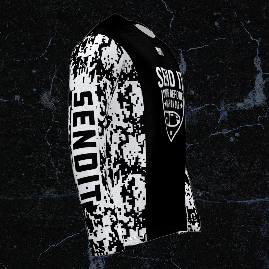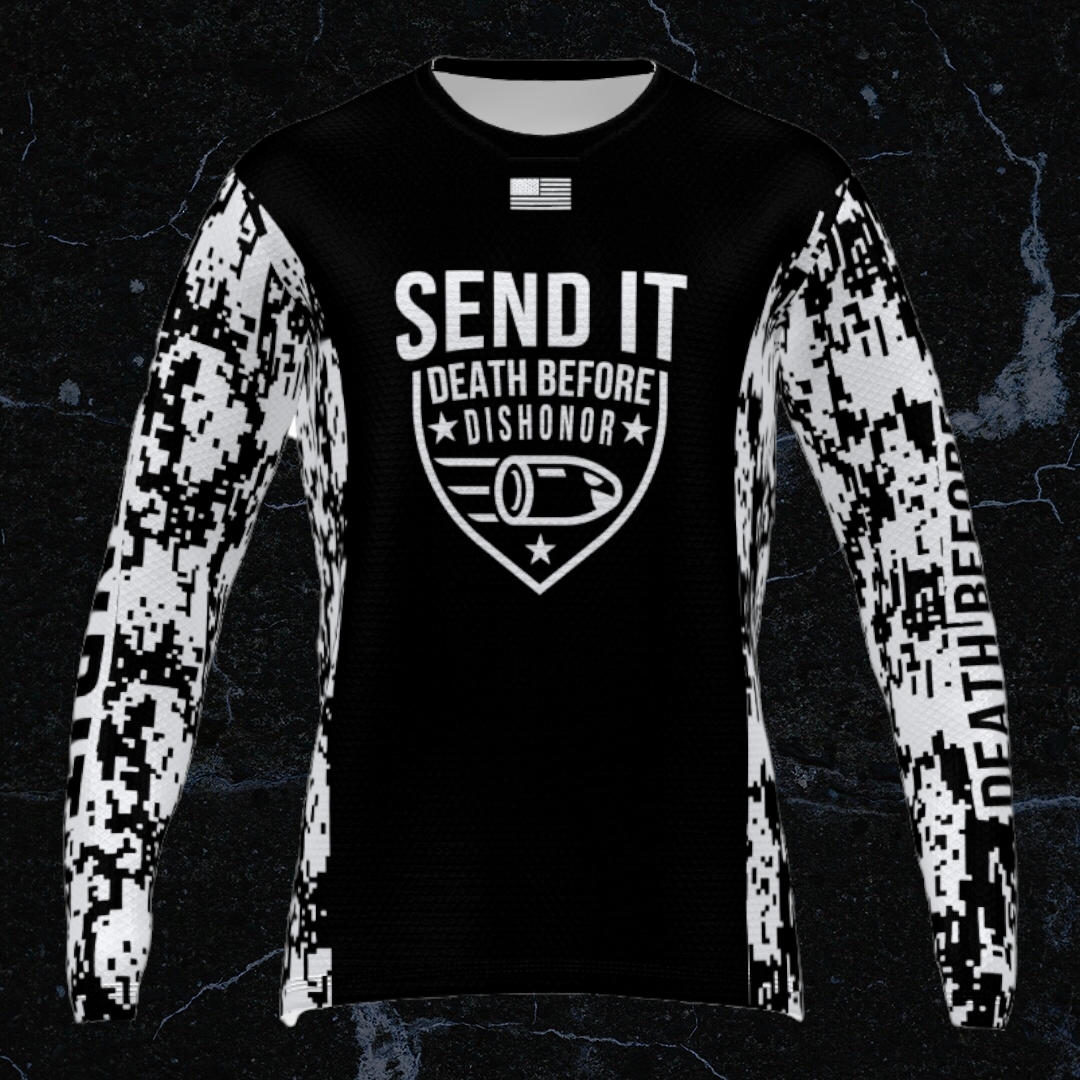 An OG design from the start. The Send It Death Before Dishonor black and white digi cam even has a hidden pocket for snacks or other things.