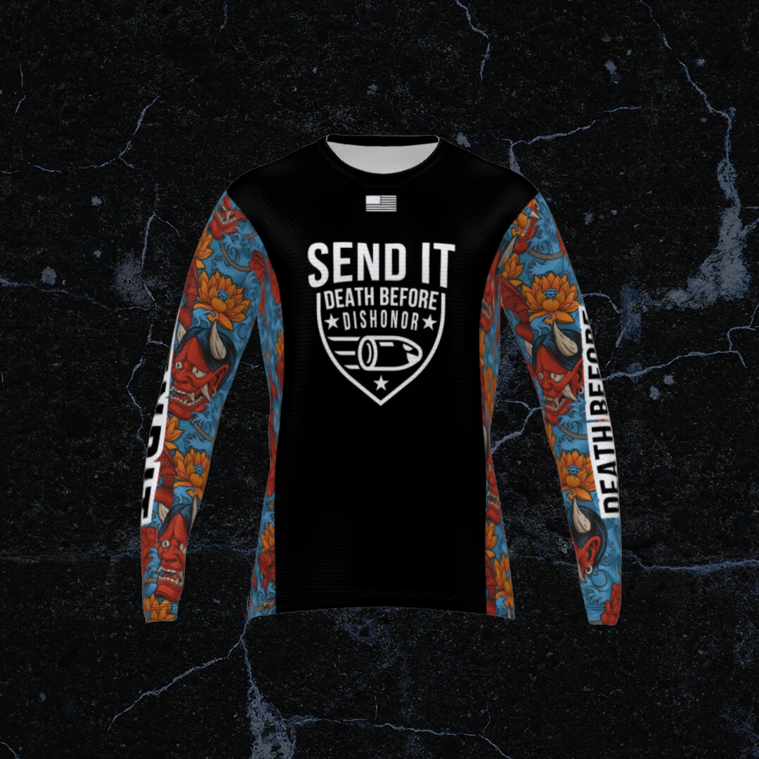 Send It Tattoo collection jersey. Looks like a Hawaiian shirt from a far but up close it has waves, koi fish and kabuki devil. Also has a hidden pocket.